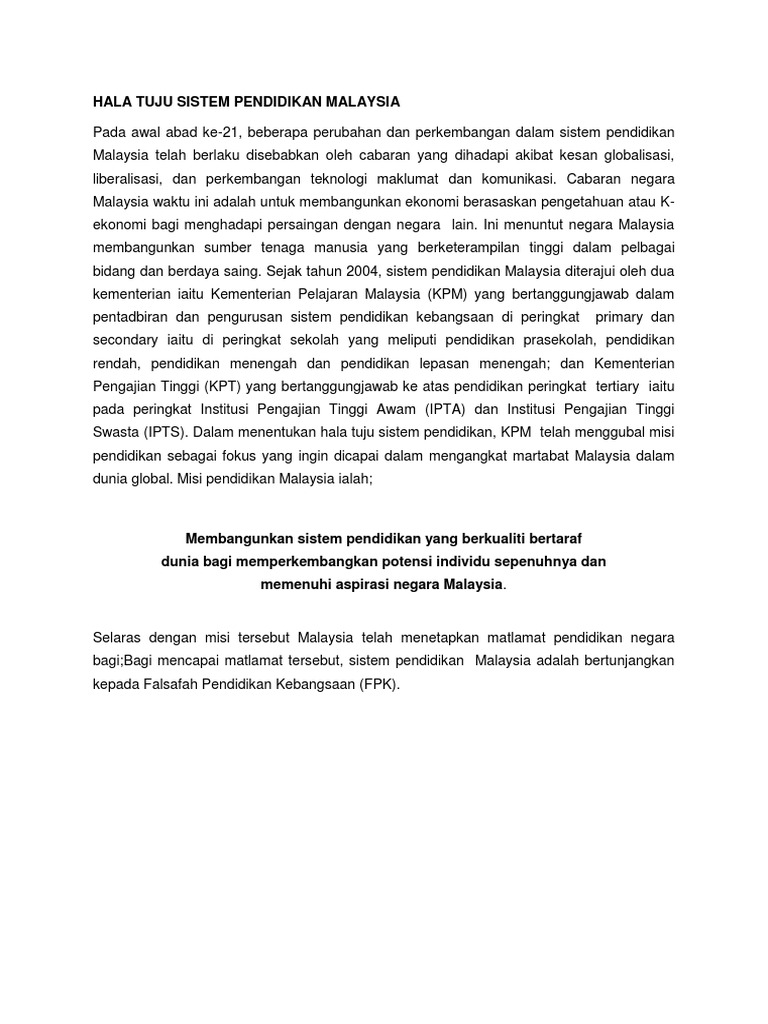 Perkembangan Pendidikan di Malaysia. Corak pendidikan yang ada pada ketika itu berjalan seperti biasa dengan pengajaran al-quran tingkah laku dan akhlak yang baik pengetahuan kerohanian dan seni mempertahankan. FPK digubal untuk memberi panduan atau arah tuju untuk.